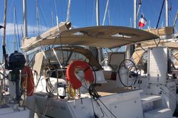 Boat equipment features a rolling mainsail, a bimini and a bow thruster. It also boasts an audio system and outside speakers. The fully-equipped galley includes ~$[aieouAIEOU].*)|(^[^aieouAIEOU].*)~(an a fridge, an oven, a cooker, a sink and kitchen utensils|a a fridge, an oven, a cooker, a sink and kitchen utensils)~.