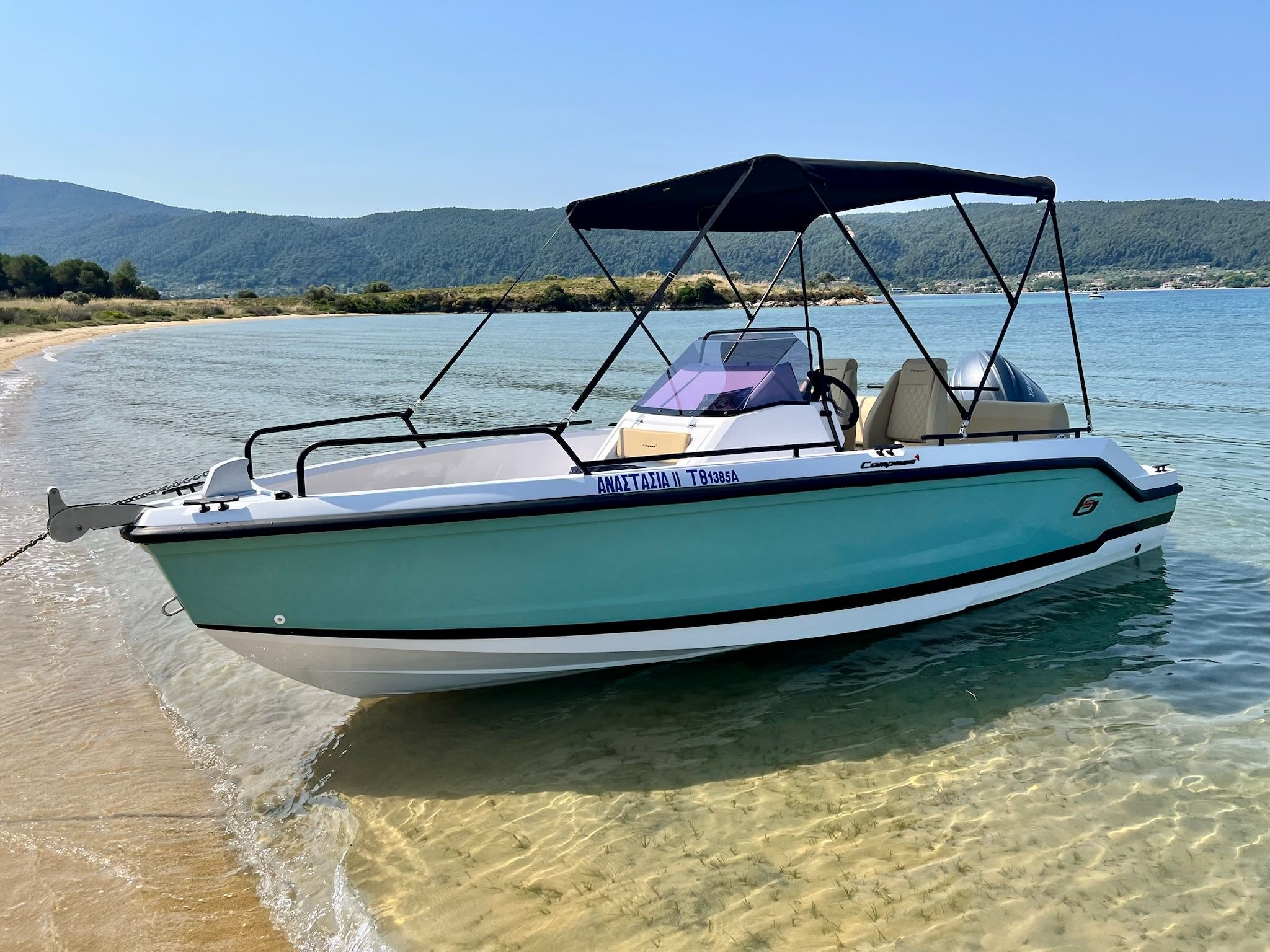 This motorboat is operated by the charter company Dream Swim Boat Rental.