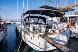 Boat equipment features a classic mainsail, electric winches, solar panels, a generator, a bimini and an outside GPS plotter. It also boasts heating, air conditioning, an audio system and outside speakers. The fully-equipped galley includes a coffee machine, a fridge, an oven, a cooker and a sink.