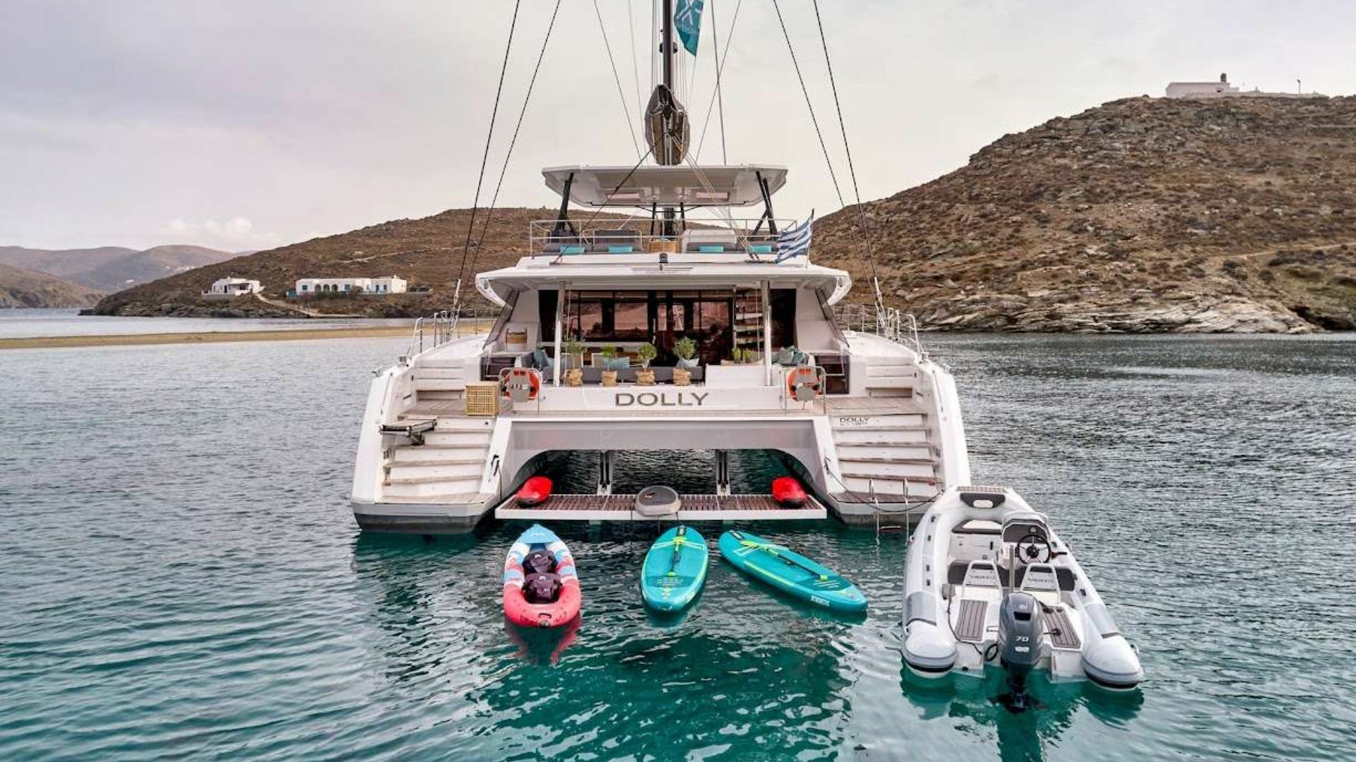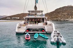 Boat equipment features a radar, a generator, a bimini and a bow thruster. It also boasts a jet ski, a flat screen TV, heating, air conditioning and an audio system. The fully-equipped galley includes a microwave, a freezer, a coffee machine, a fridge and an oven.