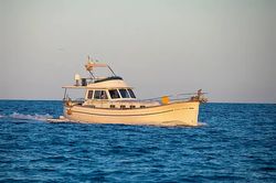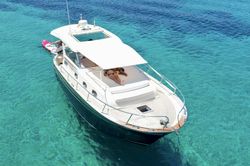Boat equipment features a radar, a generator, a salon GPS plotter, a bimini and a bow thruster. It also boasts a flat screen TV, air conditioning, an audio system, outside speakers and a flybridge. The fully-equipped galley includes a microwave, a coffee machine, a fridge, a cooker and a sink.