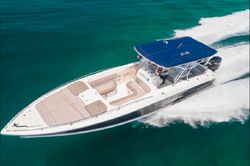 Boat equipment features a bimini and an outside GPS plotter. It also boasts a flat screen TV, an audio system, outside speakers, a flybridge and inside speakers. The fully-equipped galley includes a microwave, a fridge, a cooker, a sink and kitchen utensils.