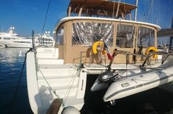 Boat equipment features a classic mainsail, solar panels, a generator, a bimini and an outside GPS plotter. It also boasts heating, air conditioning, an audio system, outside speakers and a flybridge. The fully-equipped galley includes a freezer, a coffee machine, a fridge, an oven and a cooker.