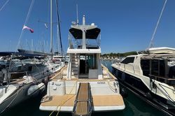 Boat equipment features a classic mainsail, a generator, a bimini and an outside GPS plotter. It also boasts heating, air conditioning, an audio system, outside speakers and a flybridge. The fully-equipped galley includes a freezer, a fridge, an oven, a cooker and a sink.