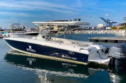 Motorový člun Bravo 380 - Salamat vyroben v roce 2021 je vhodný pro 17 lidí. Je zakotven v Marina Santa Marta, Kolumbie.