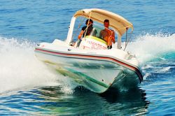Motorový člun Solemar B22 - Narkissos vyroben v roce 2009 je vhodný pro 8 lidí. Je zakotven v Longos, Řecko.