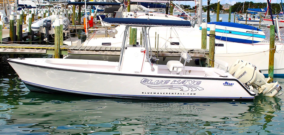 Motorový člun Stuart 27 - Stuart 2 vyroben v roce 2023 je vhodný pro 10 lidí. Je zakotven v Harbour view marina, Bahamy.