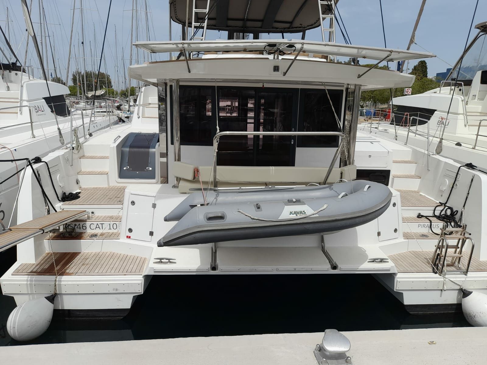 Bali ist mit einem ein Durchgelattetes Großsegel, Elektrische Winden, Solarmodule, ein Kartenplotter im Salon, ein Bimini, ein Außen-GPS-Plotter, ein Soundsystem, Außen-Lautsprecher, ein Stand-up Paddle, Innen-Lautsprecher sowie einer vollausgestatteten Küche inklusive eine Kaffeemaschine, ein Kühlschrank, ein Ofen, ein Herd und ein Spülbecken ausgestattet.