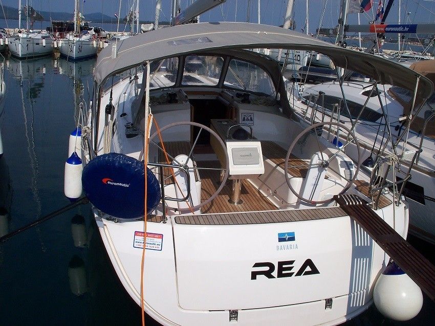 Bavaria ist mit einem ein Rollgroßsegel, Solarmodule, ein Bimini, ein Bugstrahlruder, Heizung, ein Soundsystem, Außen-Lautsprecher, Innen-Lautsprecher sowie einer vollausgestatteten Küche inklusive ein Kühlschrank, ein Ofen, ein Herd, ein Spülbecken und ein Küchenutensilien ausgestattet.