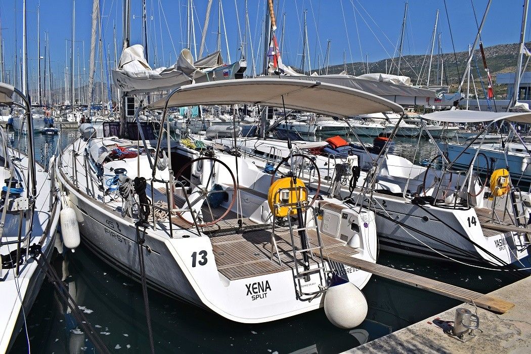 3-Kabinen Segelboot Beneteau First 45 - Xena wurde im Jahr 2013 gebaut und liegt in Marina Kaštela, Kroatien.