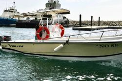 Das Bravo 320 - Papebupa Motorboot aus dem Jahr 1991 bietet Platz für 14 Personen. Es ist in Marina Santa Marta, Kolumbien angedockt.