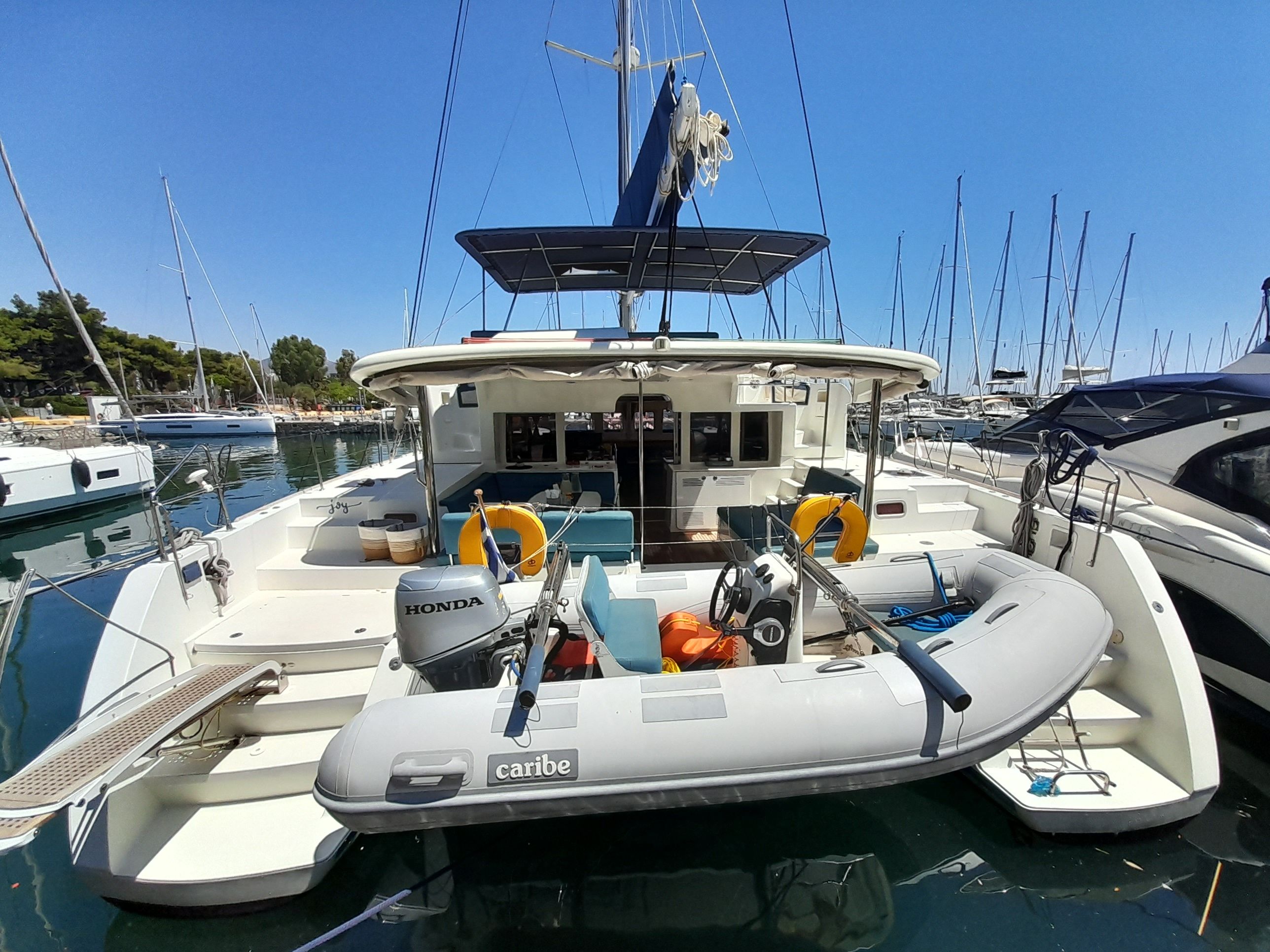 Der 6-Kabinen Katamaran Lagoon 450 F - Joy wurde im Jahr 2012 gebaut und 2025 renoviert. Das Boot liegt in Marina Alimos, Griechenland.