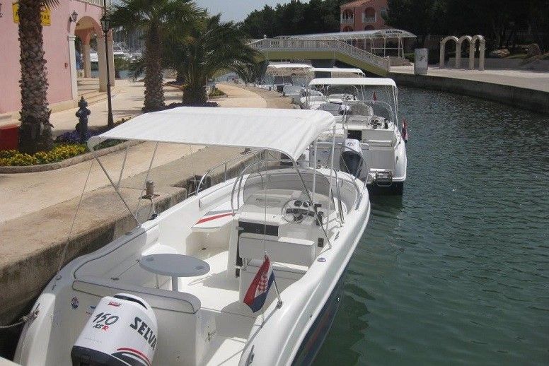 Das Marine 6.6 - Selva Open Motorboot aus dem Jahr 2012 bietet Platz für 8 Personen. Es ist in Marina Frapa, Kroatien angedockt.