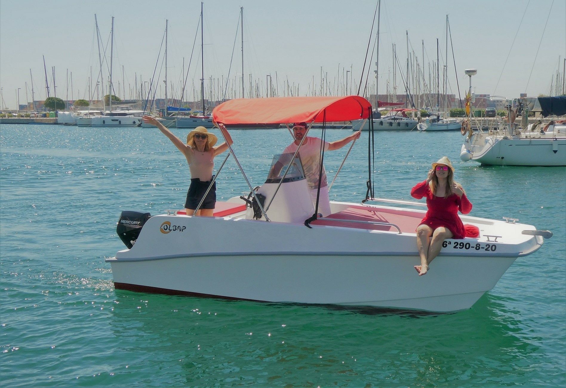 Das Olbap 5 - Happy 2 Motorboot aus dem Jahr 2020 bietet Platz für 6 Personen. Es ist in Real Club Nàutic de València, Spanien angedockt.