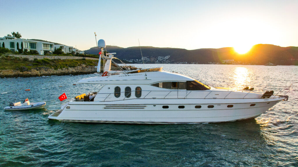 4-Kabinen Motoryacht Princess 20 - Carmen wurde im Jahr 1997 gebaut und 2020 renoviert. Das Boot liegt in Bodrum City Harbour, Türkei.