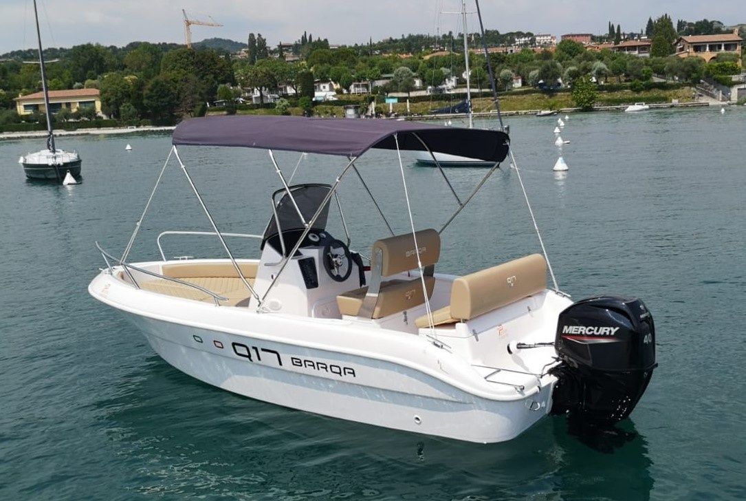 Esta lancha a motor Barqa Q17 - Barqa 2020 es adecuada para 6 personas. Está atracada en Moniga Porto, Italia.