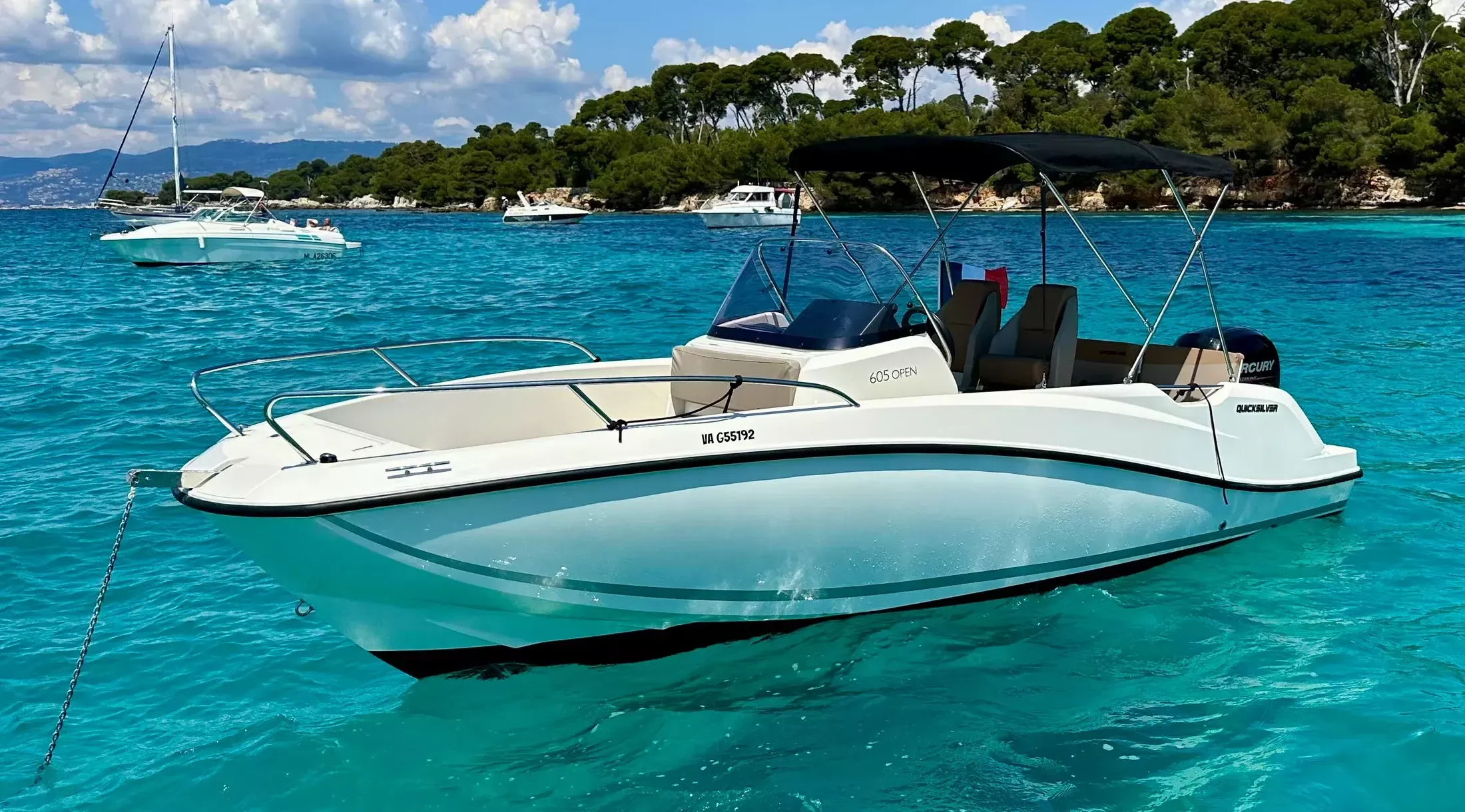 See 2024 Quicksilver Activ 605 Open - Seaside mootorpaat on sobilik kuni 7 inimesele. See on dokitud asukohas Port de la Rague, Prantsusmaa.