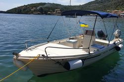 Šis 2019 Olympic 490 - Iris motorlaivis tinkamas 5 žmonėms. Jis prišvartuotas Port of Ithaca, Graikija.