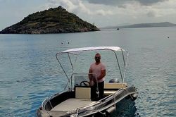 Šis 2011 Ranieri 19 - Shark motorlaivis tinkamas 7 žmonėms. Jis prišvartuotas Limni Keri Harbour, Graikija.