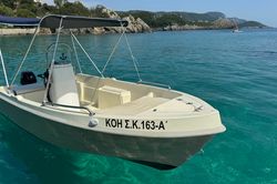 Deze 2023 Assos 450 - Anthi motorboot is geschikt voor 3 personen. Het ligt aangemeerd in Alipa Port, Griekenland.