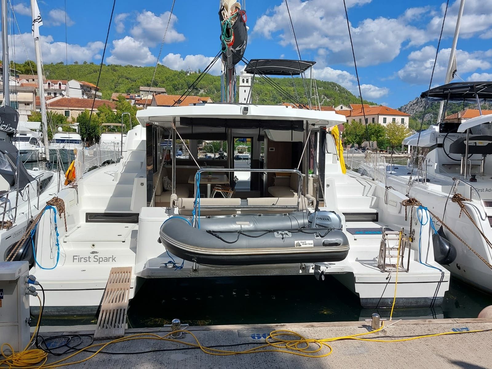 De catamaran Bali 4.2 - First Spark met 5 kajuiten is gebouwd in 2023 en ligt aangemeerd in ACI Marina Skradin, Kroatië.