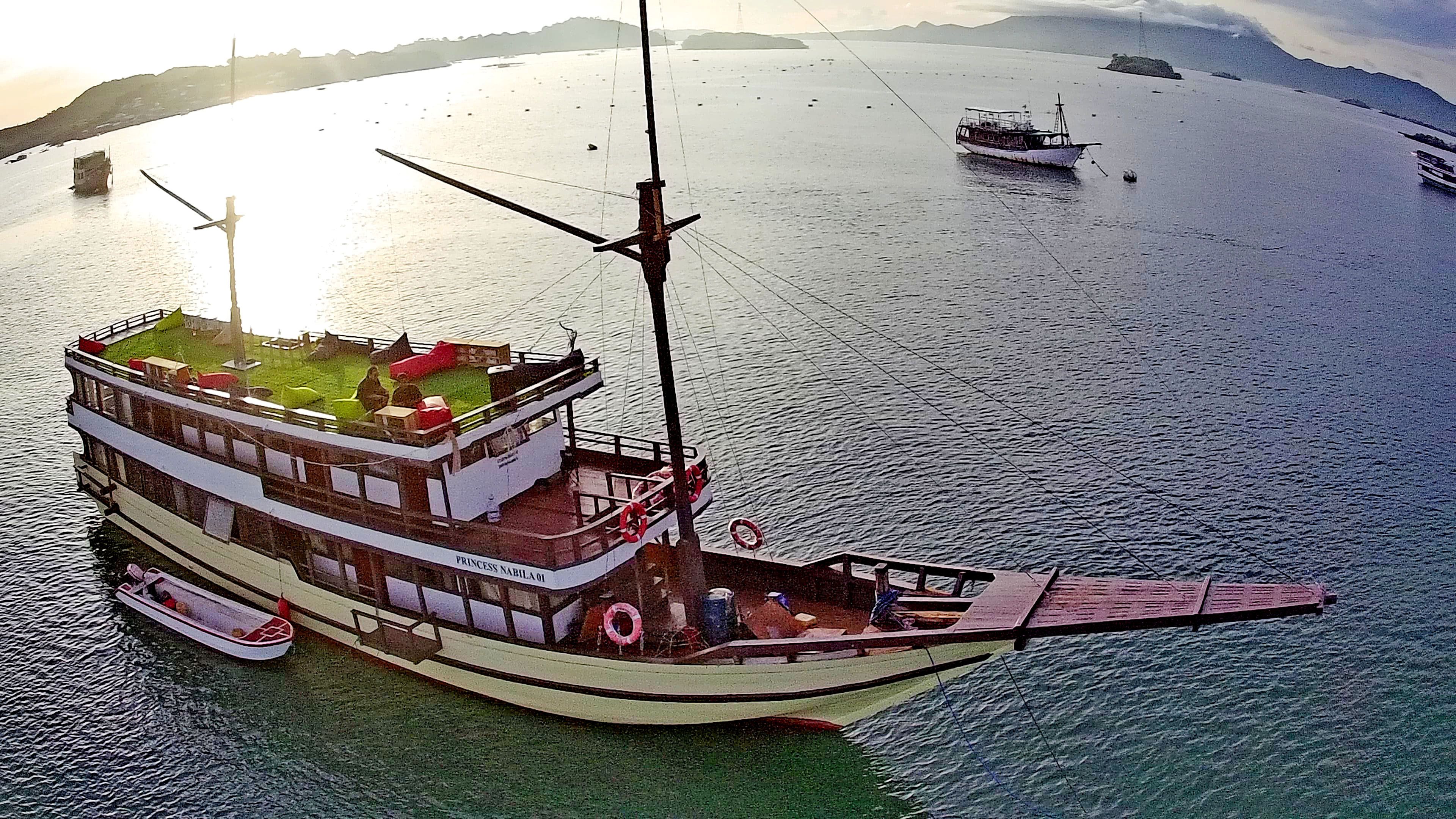 Het motorjacht Custom Built 108 - Princess Nabila met 7 kajuiten is gebouwd in 2025 en ligt aangemeerd in Labuan Bajo Marina, Indonesië.