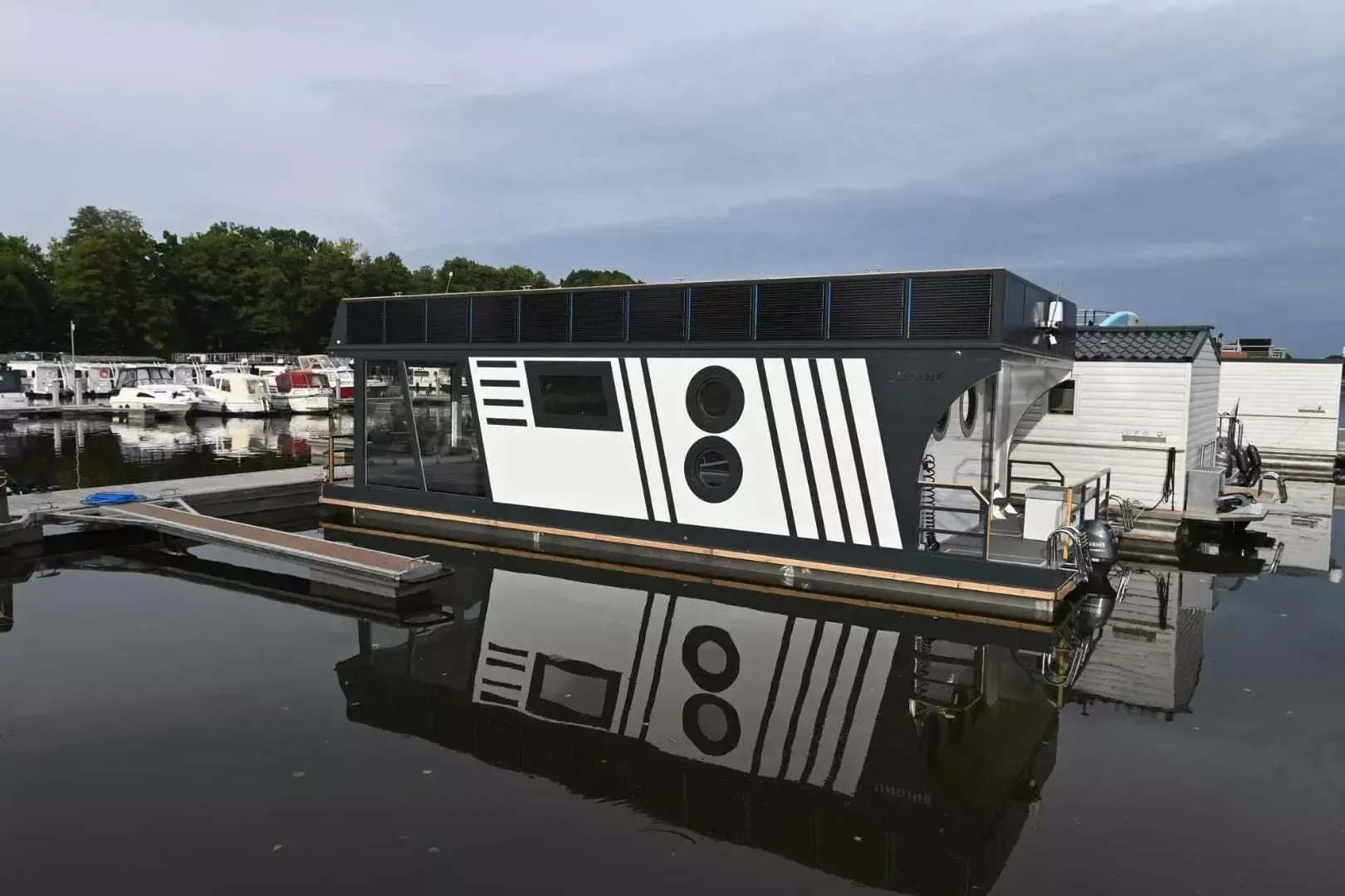 De Custom Built 39 Undine mit Sauna woonboot is gebouwd in 2022 enit ligt aangemeerd in de haven Marina Buchholz, Duitsland.