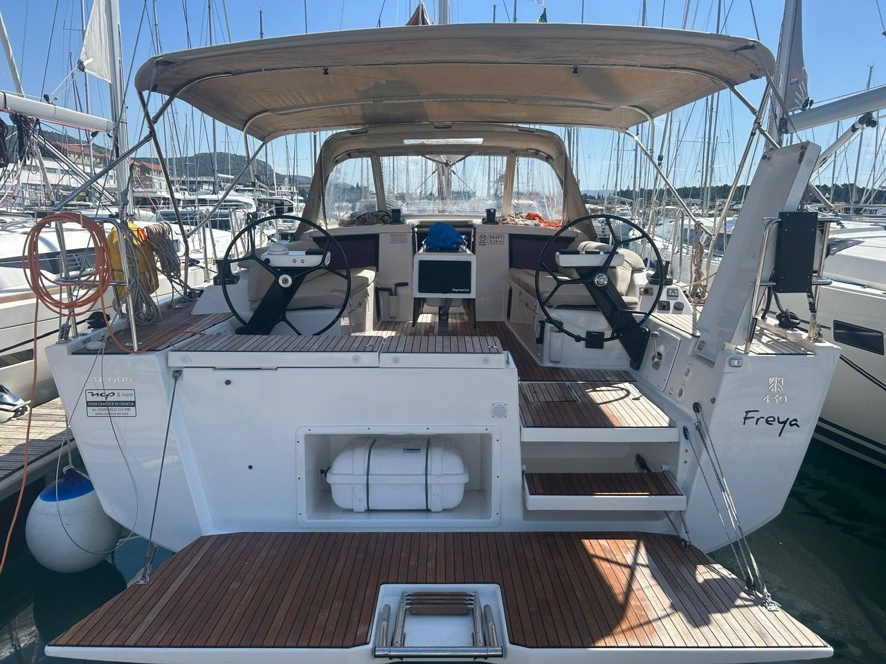 Het zeiljacht Dufour 430 - Freya met 4 kajuiten is gebouwd in 2023 en ligt aangemeerd in D-Marin Marina Mandalina, Kroatië.