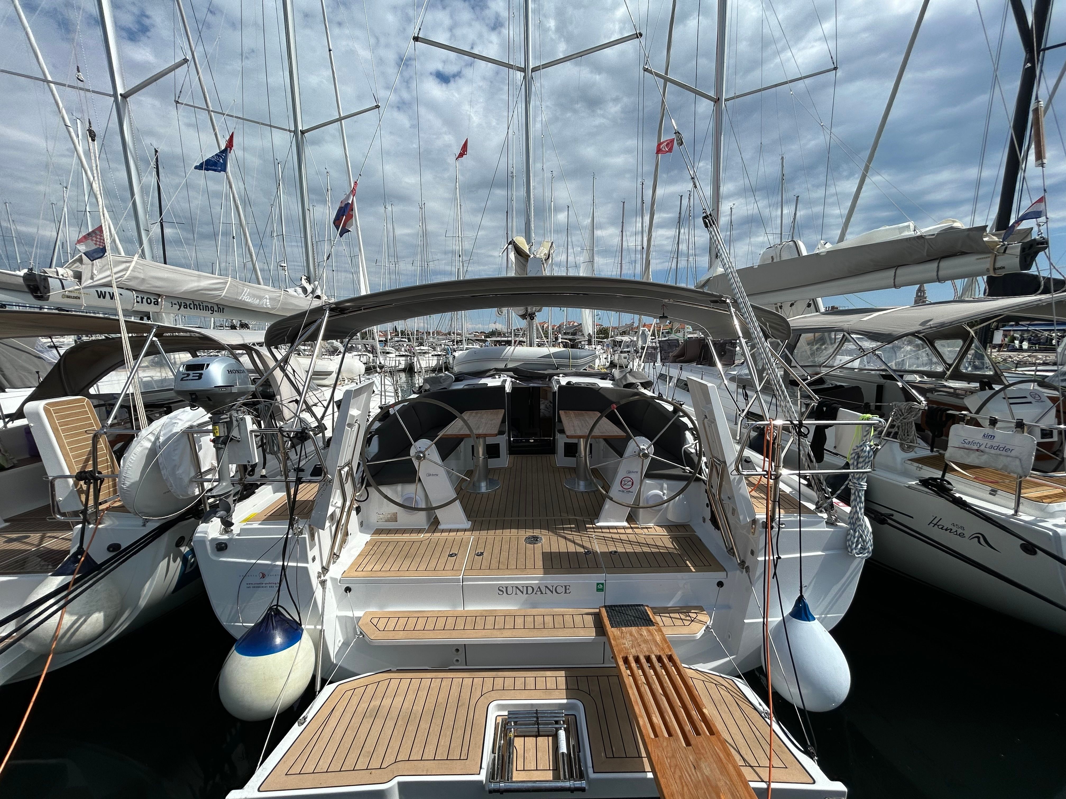 Het zeiljacht Hanse 410 - Sundance met 3 kajuiten is gebouwd in 2025 en ligt aangemeerd in Marina Kornati, Kroatië.