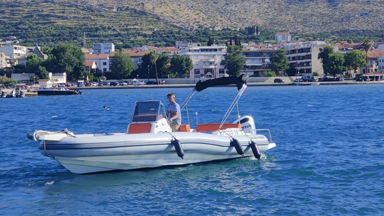 Deze 2022 Marlin 790 Dynamic - 22 motorboot is geschikt voor 12 personen. Het ligt aangemeerd in Trogir center pier, Kroatië.