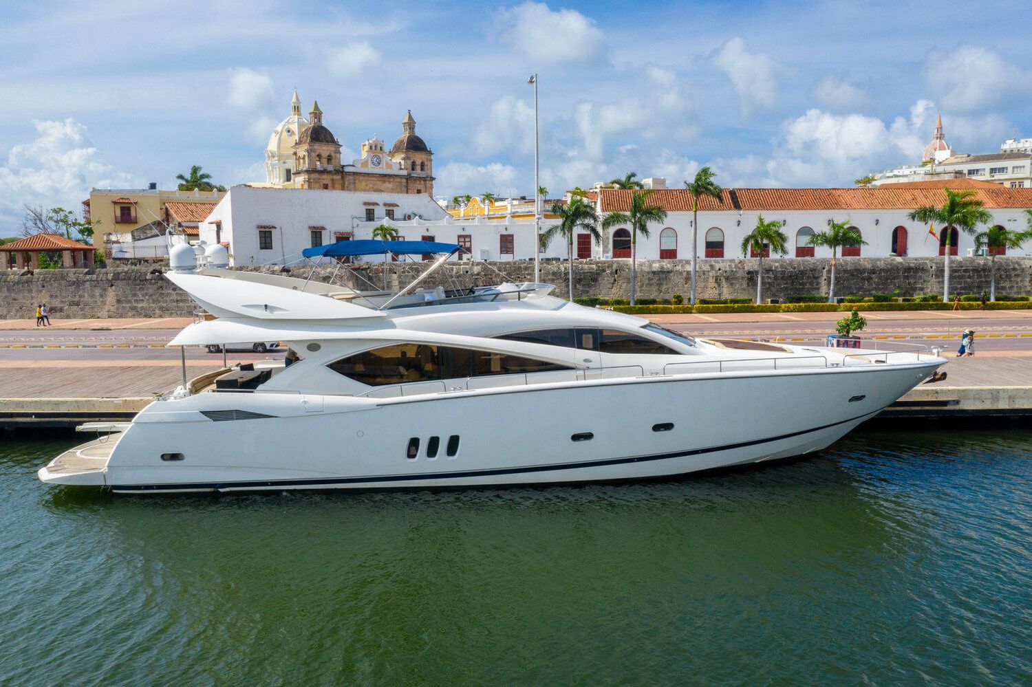 Het motorjacht Sunseeker 82 - Martlet met 4 kajuiten is gebouwd in 2004 (gerenoveerd in 2014) en ligt aangemeerd in Nautico de Cartagena, Colombië.