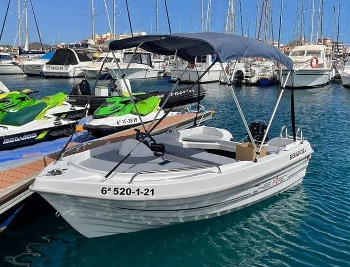 Ta łódź motorowa 2021 Dipol 400 - First nadaje się dla 5 osób. Jest zacumowana w Marina del Sur, Hiszpania.