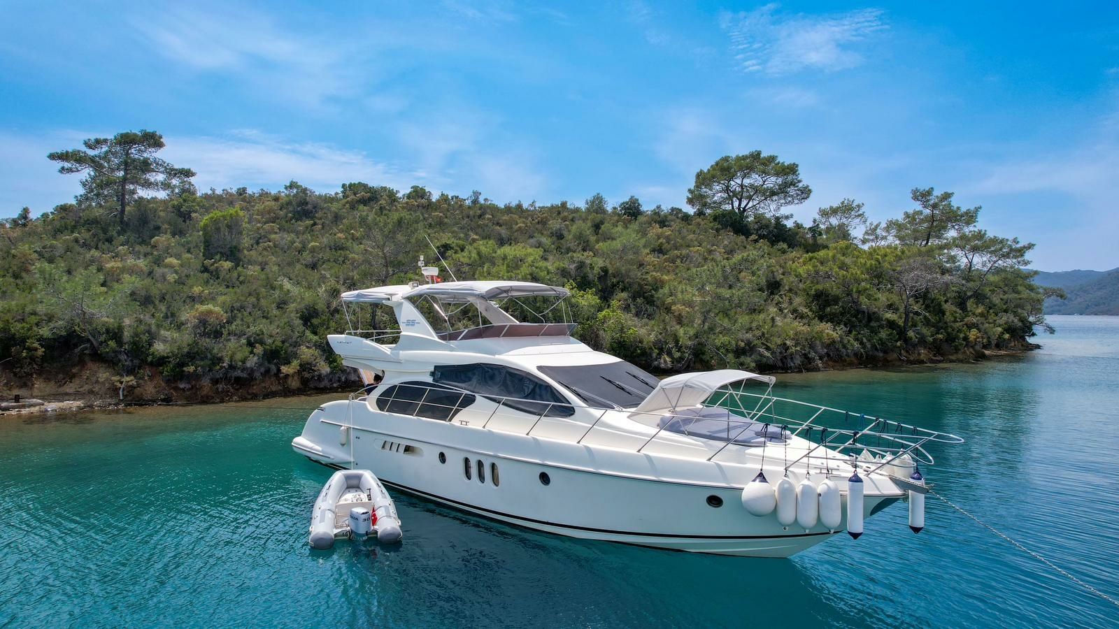 Este iate a motor de 3 cabinas Azimut 55 - Mirac foi construído em 2004 e renovado em 2022. Está atracado em Göcek Muçev Marina, Turquia.
