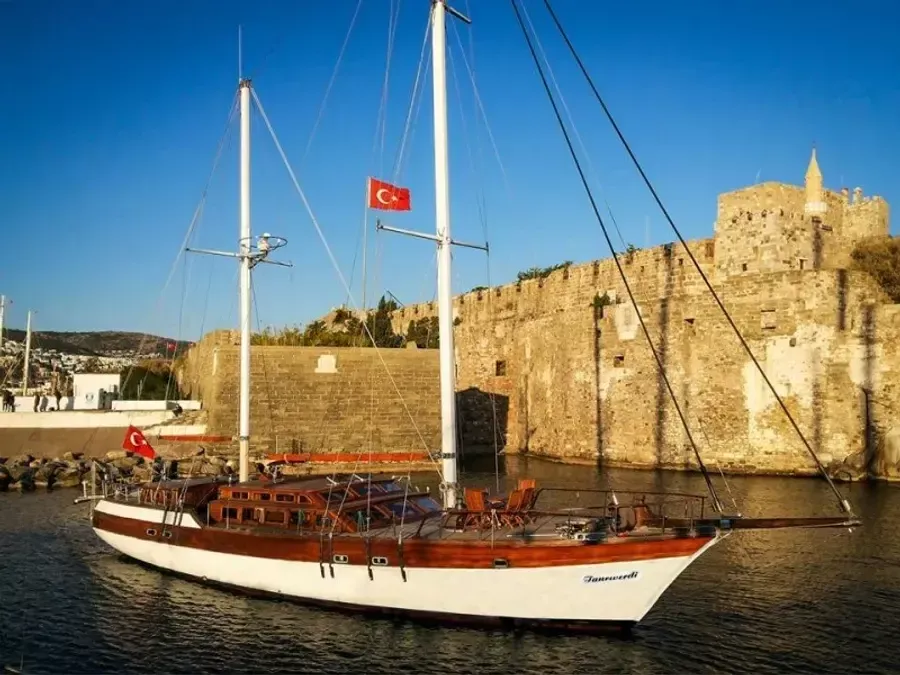 Esta escuna de 28 m de comprimento foi construída em 1995 e renovada em 2012. Está atracada em Bodrum City Harbour, Turquia.