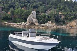 Este barco a motor Poseidon 550 - Masa Grande de 2024 é adequado para 5 pessoas. Está atracado em Agios Nikolaos Volimes Zakynthos, Grécia.