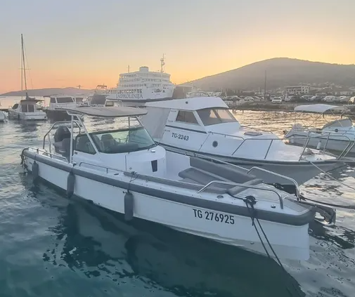 Motorbåten 2022 Axopar 28 - 22 är lämpad för 9 personer. Den ligger förtöjd i Trogir center pier, Kroatien.
