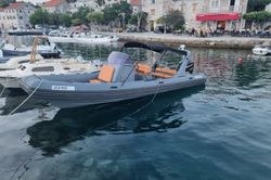 Motorbåten 2012 Barracuda 23 - 12 är lämpad för 8 personer. Den ligger förtöjd i Plaža Sveta Nedjelja, Kroatien.