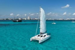 Denna katamaran drivs i Mexiko av charterbolaget Riviera Maya Catamarans.