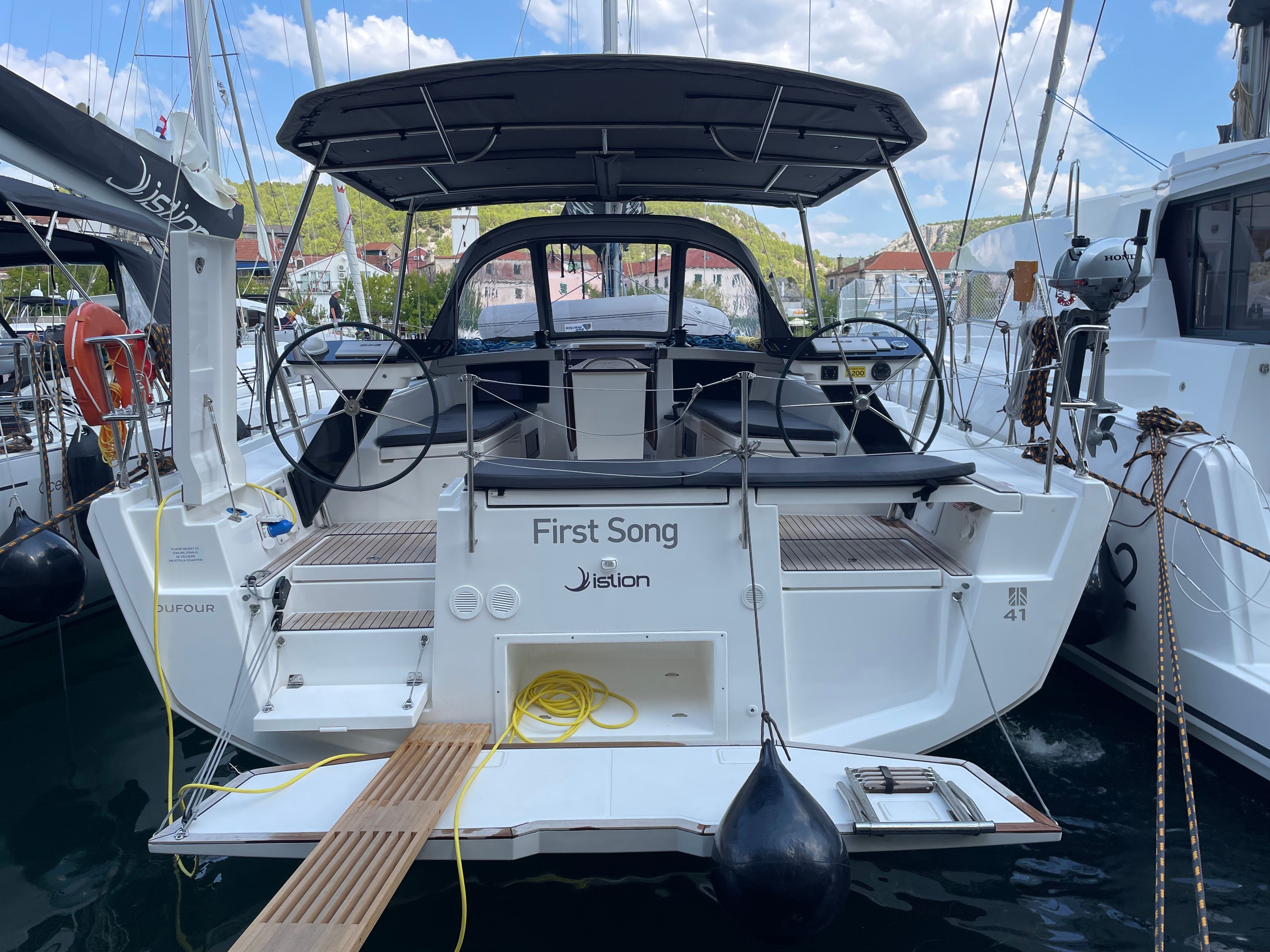 Segelbåt Dufour 41 - First Song, är byggd 2024, har 3-hytter och ligger förtöjd i ACI Marina Skradin, Kroatien.