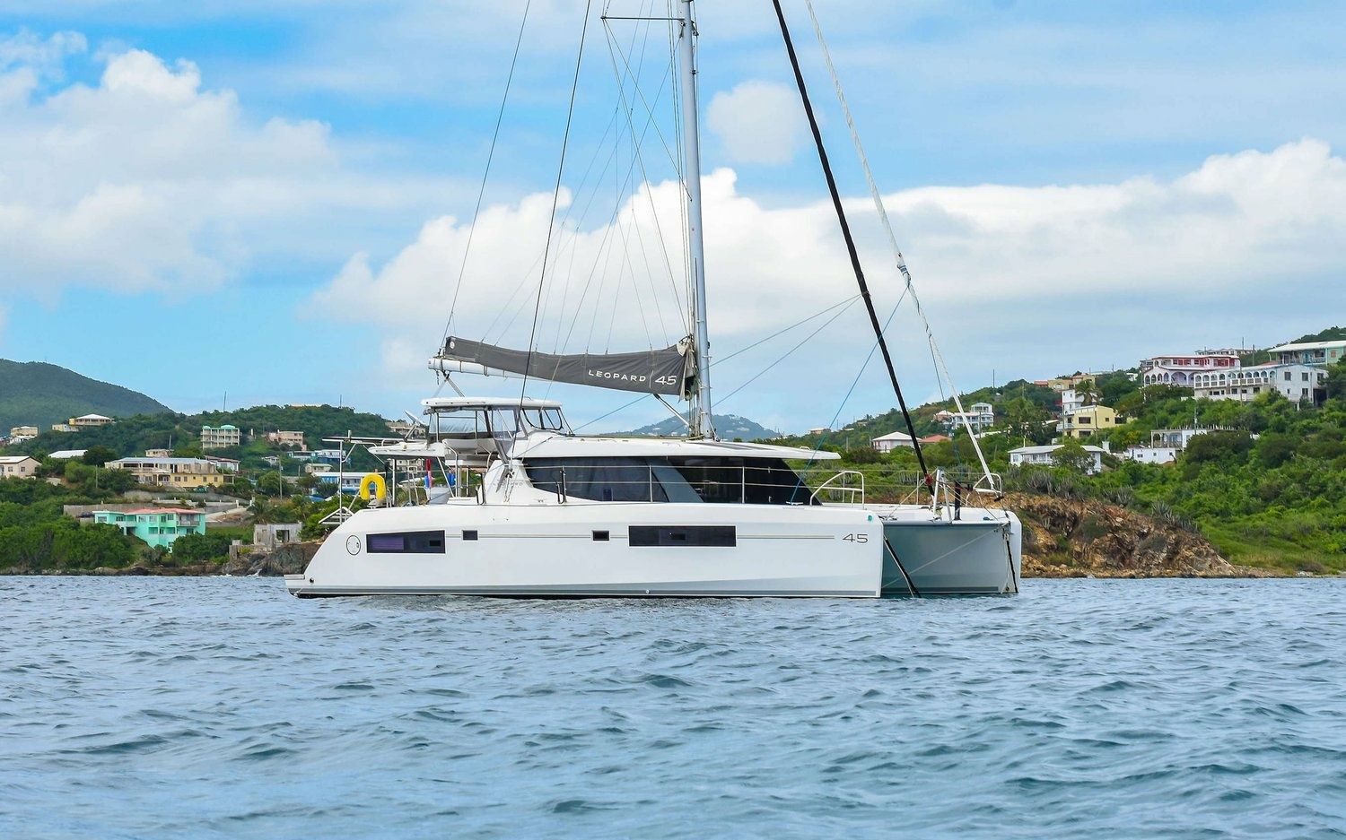 Katamaran Leopard 45 - Sisu, är byggd 2018, har 2-hytts och ligger förtöjd i Nanny Cay Resort & Marina, Västindien.
