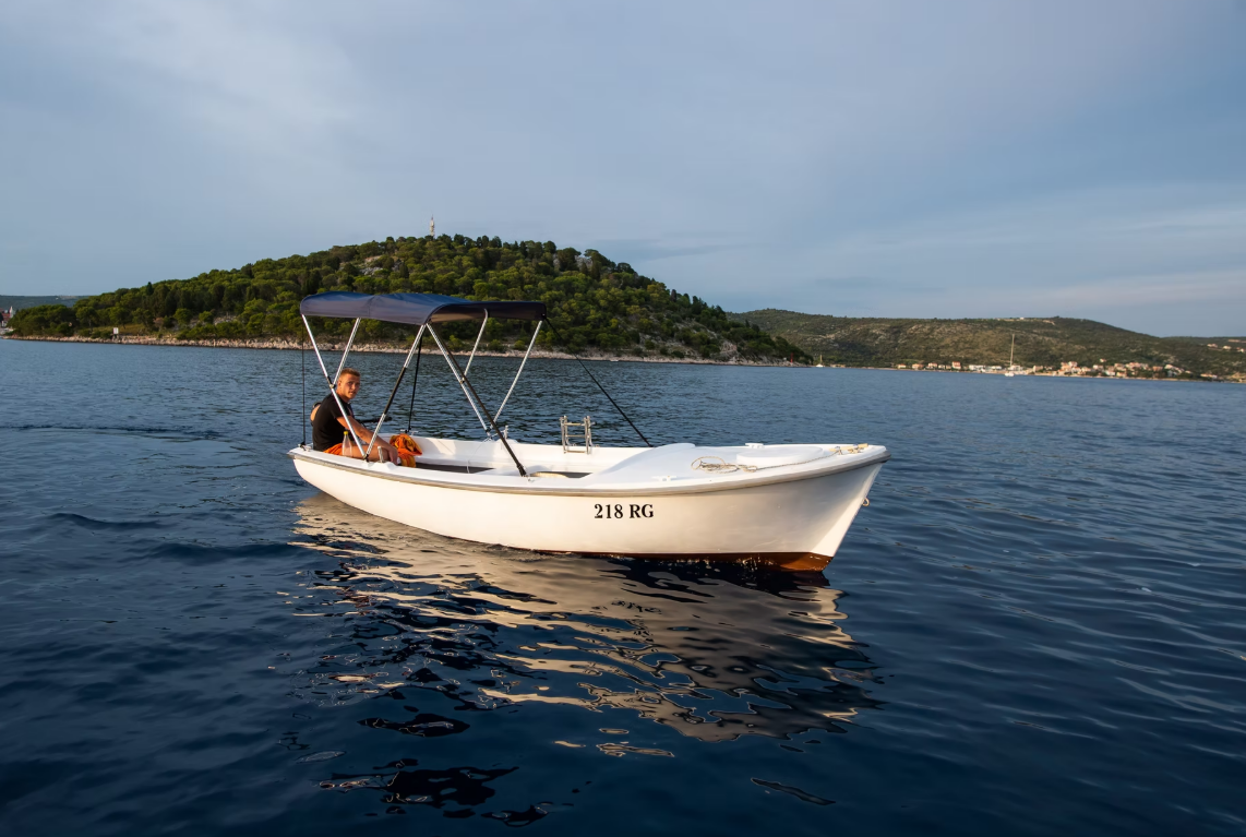 Motorbåten 1979 Pasara 5 - 79 är lämpad för 6 personer. Den ligger förtöjd i Očeva luka, Kroatien.