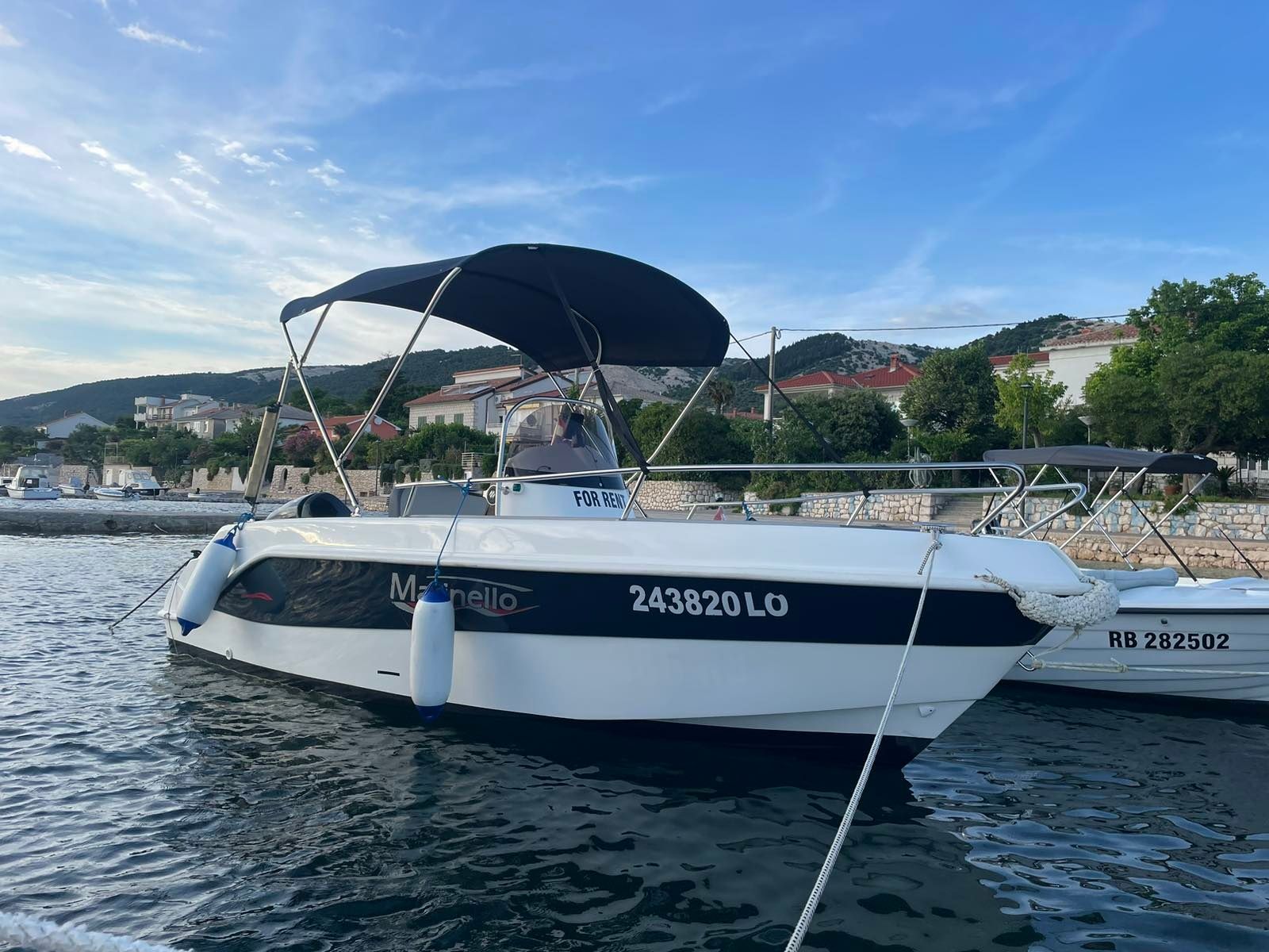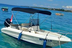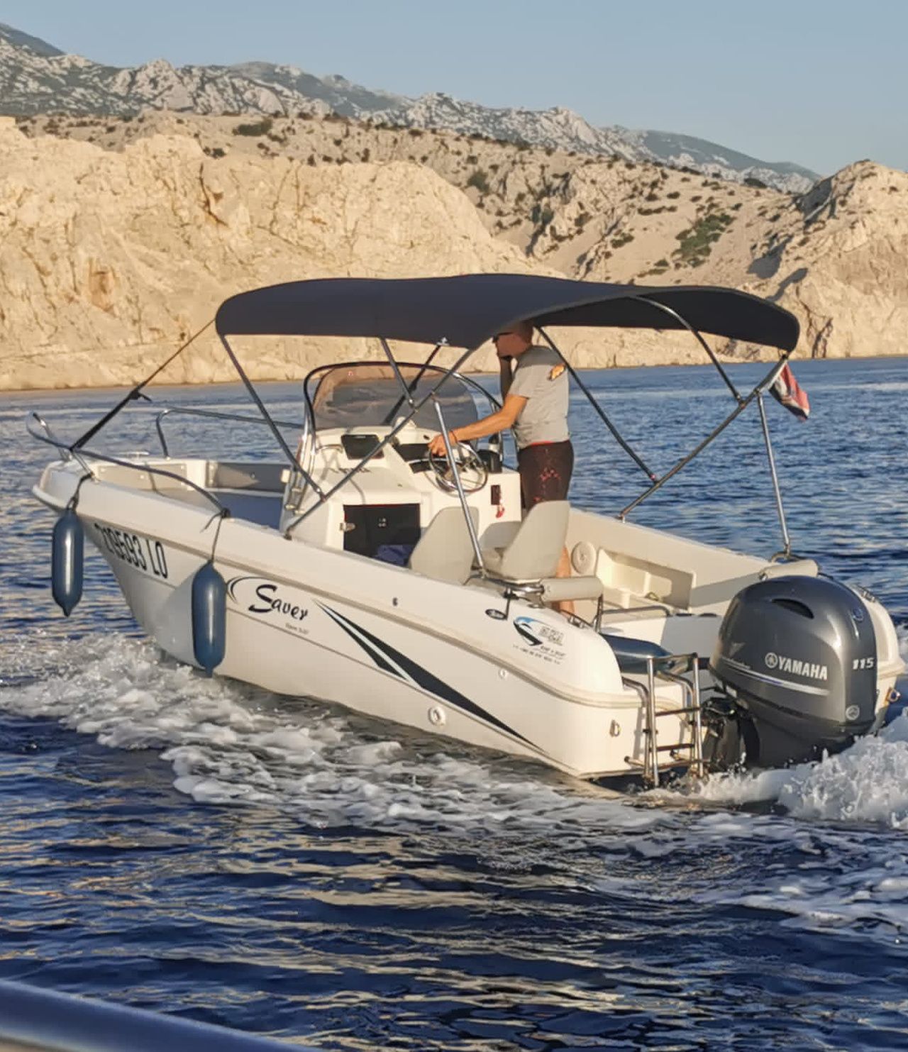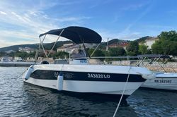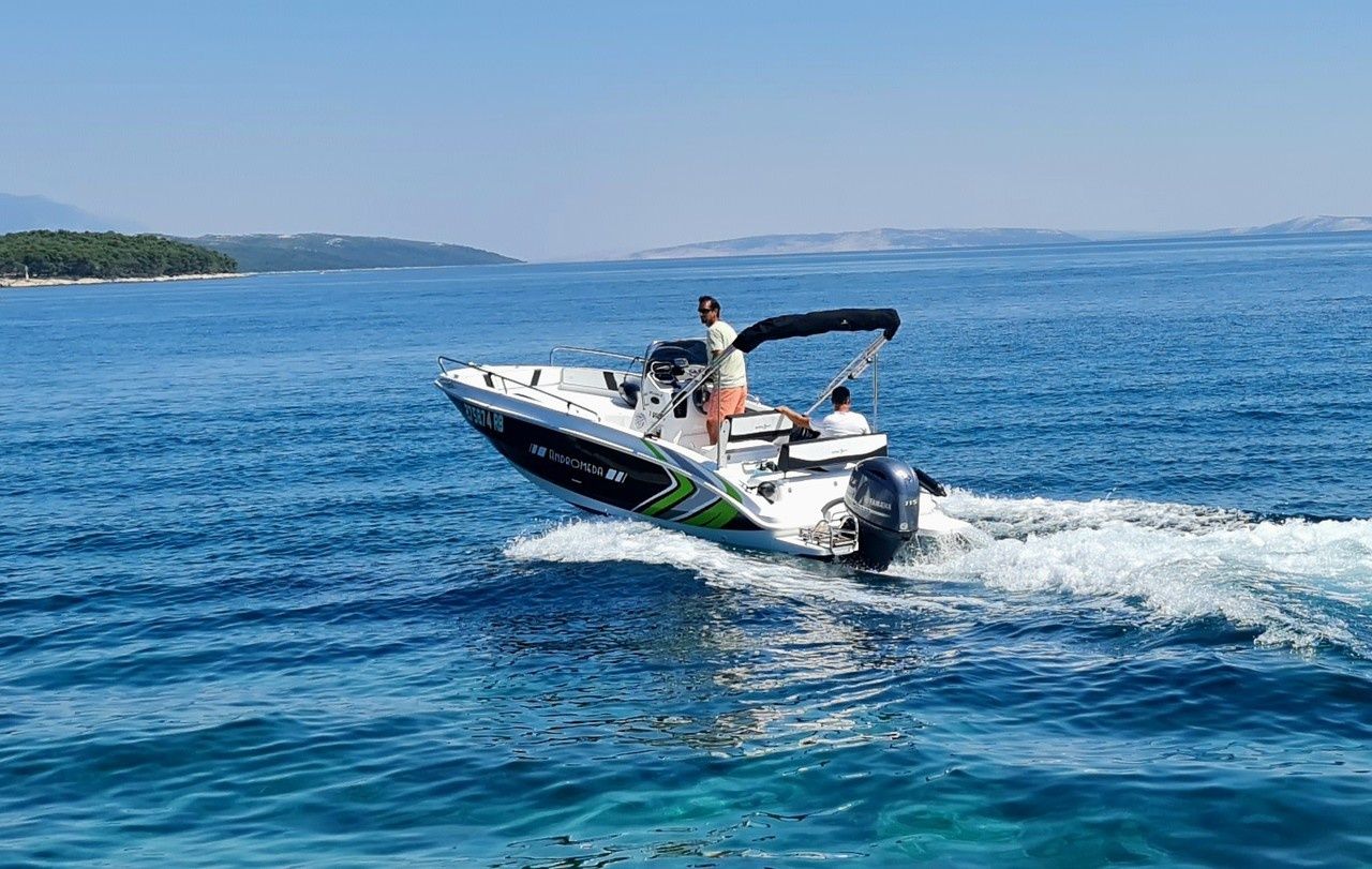 Motorbåten 2013 Saver 580 - 13 är lämpad för 6 personer. Den ligger förtöjd i Port of Rab, Kroatien.