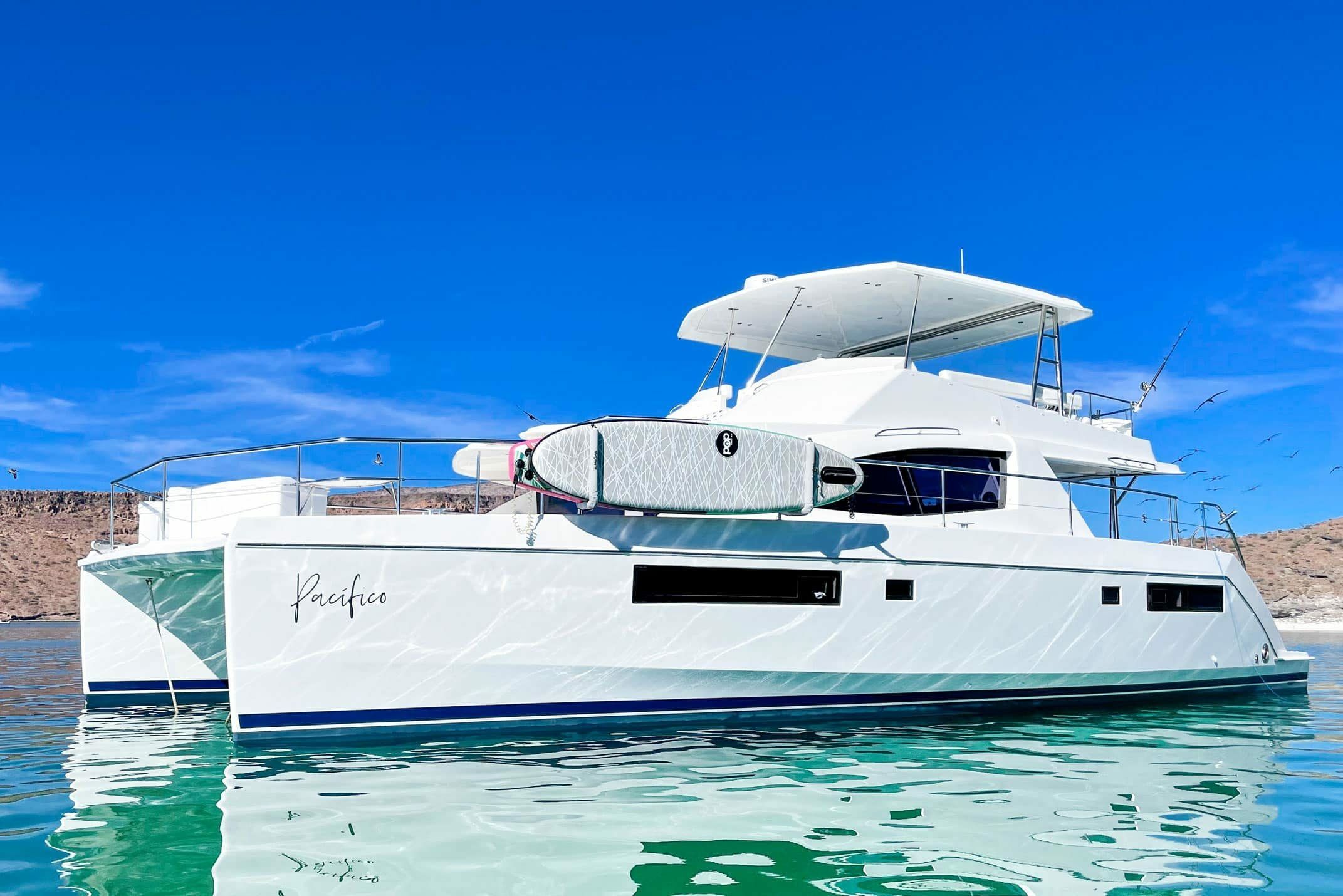 4-kabinski motorni katamaran Leopard 51 PC - Pacifico je bil zgrajen leta 2015 in je zasidran v marini Marina La Paz, Mehika.