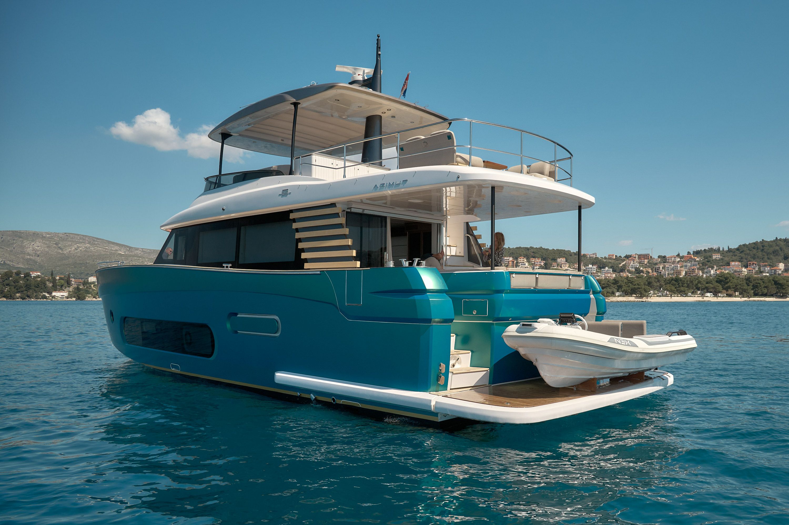 Boat equipment features a generator, a salon GPS plotter, a bimini and a bathing platform. It also boasts a flat screen TV, heating, air conditioning, an audio system and outside speakers. The fully-equipped galley includes a dishwasher, a freezer, a coffee machine, a fridge and an oven.