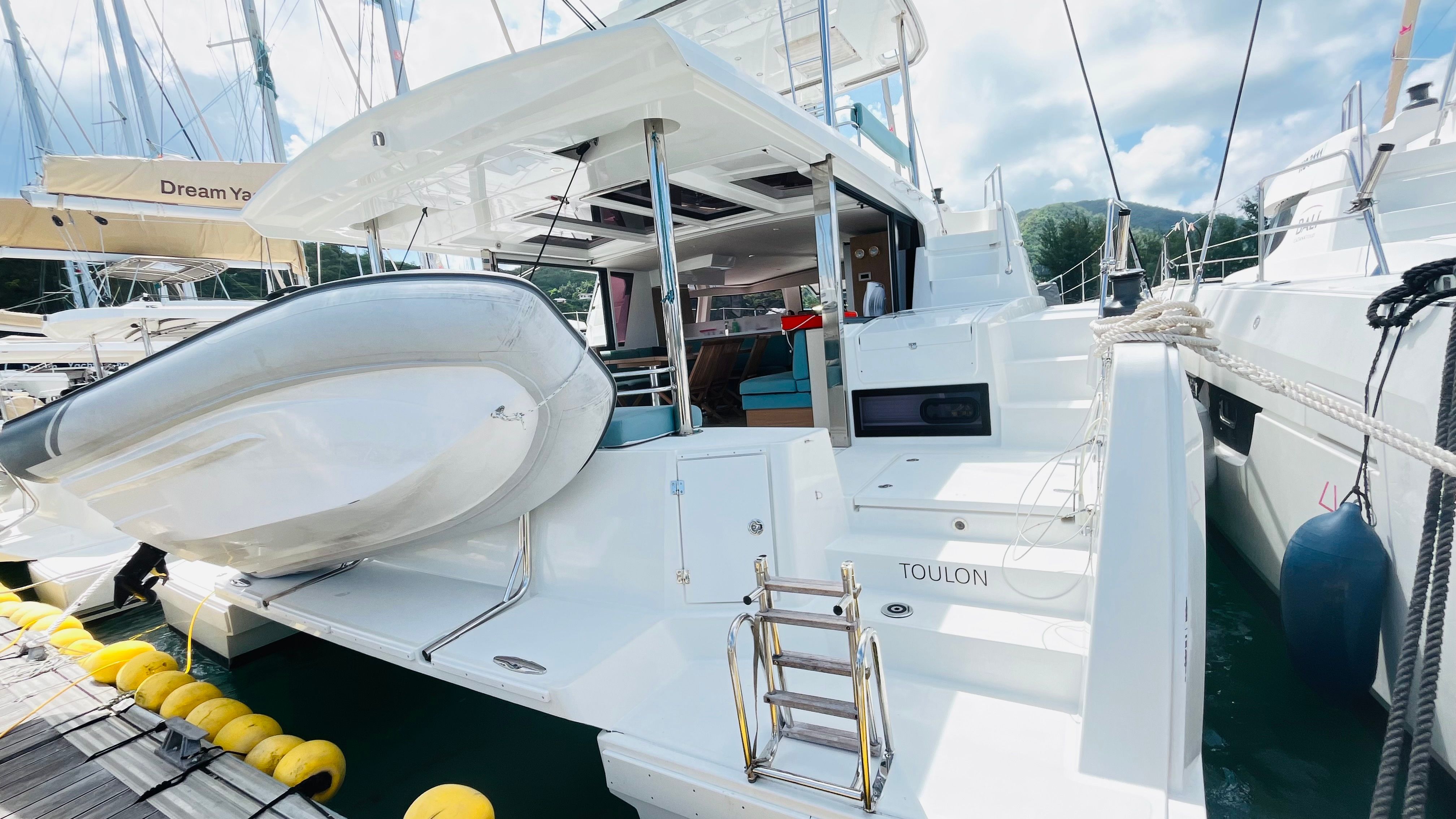 This 2005 Custom Built 28 - Delfino is suitable for 14 people. It is docked in Praslin Marina, Seychelles.