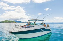 Boat equipment features a radar, a salon GPS plotter and a bimini. It also boasts an audio system and outside speakers. The fully-equipped galley includes a fridge and a sink.